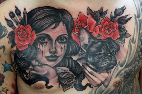 胸部old school彩色哭泣女人与狗和花朵纹身图案