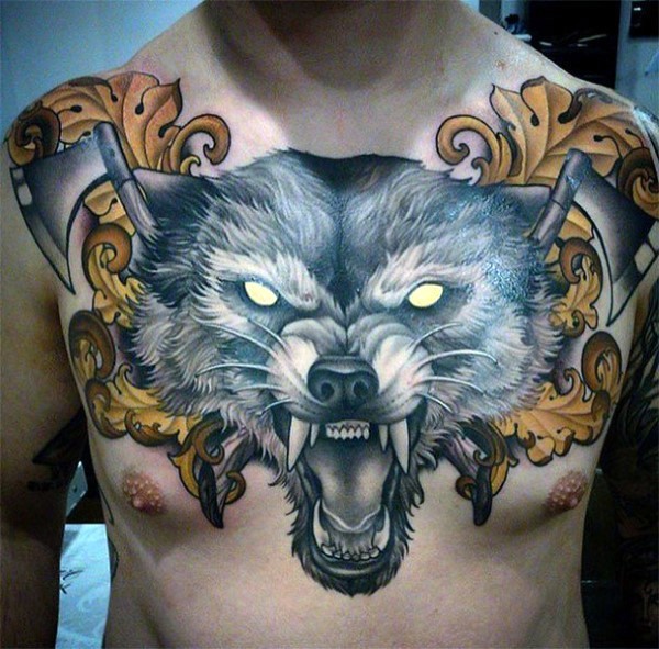new school鲜艳的彩绘狼头和斧头纹身图案