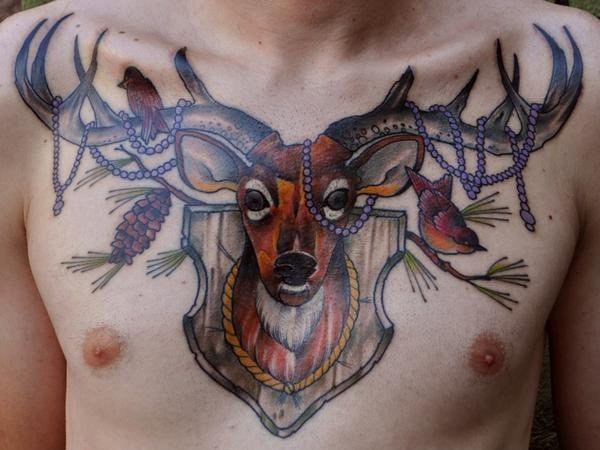 胸部school彩色鹿头小鸟纹身图案