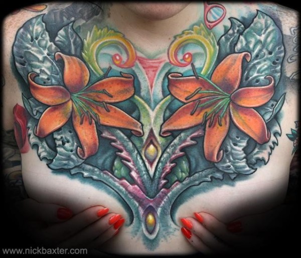 胸部自然彩色各种花卉纹身图案