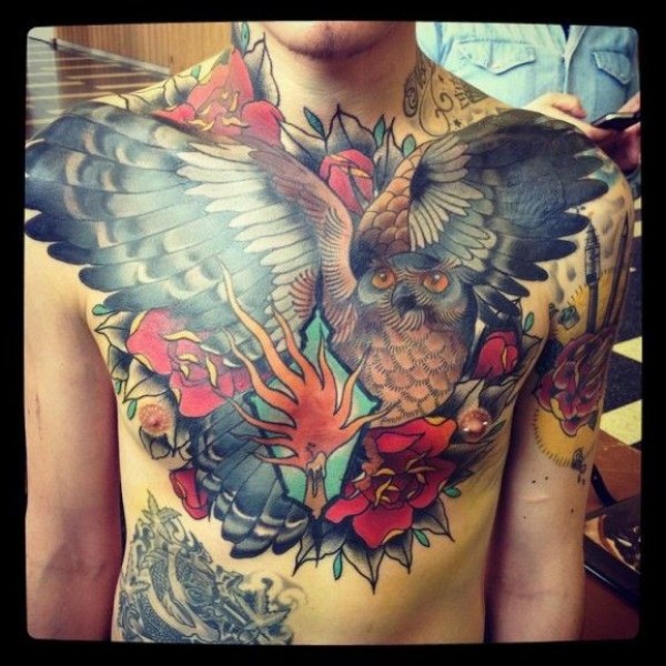 胸部彩绘猫头鹰鲜花和蜡烛纹身图案