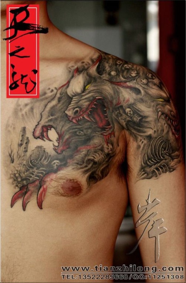 肩膀和胸部可怕的血腥恶魔狗彩色纹身图案