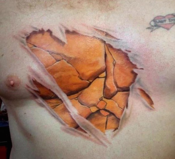 胸部彩色皮肤撕裂与岩石肌肉纹身图案