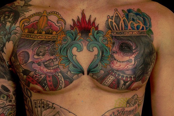 胸部墨西哥土著彩色骷髅国王和王后纹身图案