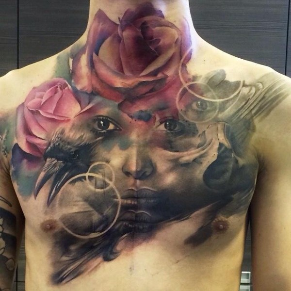 胸部神秘的女人肖像结合乌鸦和玫瑰纹身图案