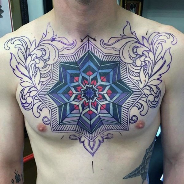 胸部五彩的曼陀罗装饰纹身图案