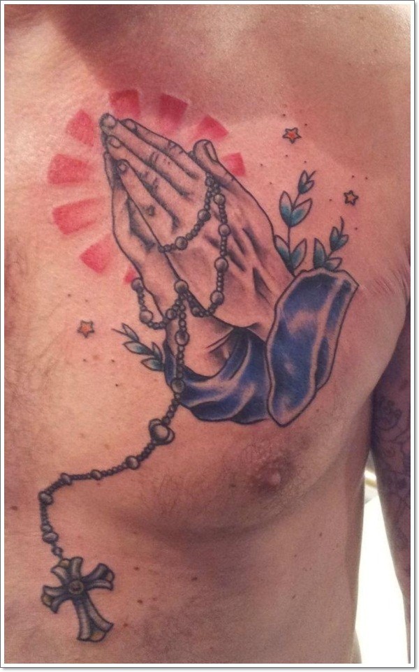 胸部祈祷手交十字架植物纹身图案