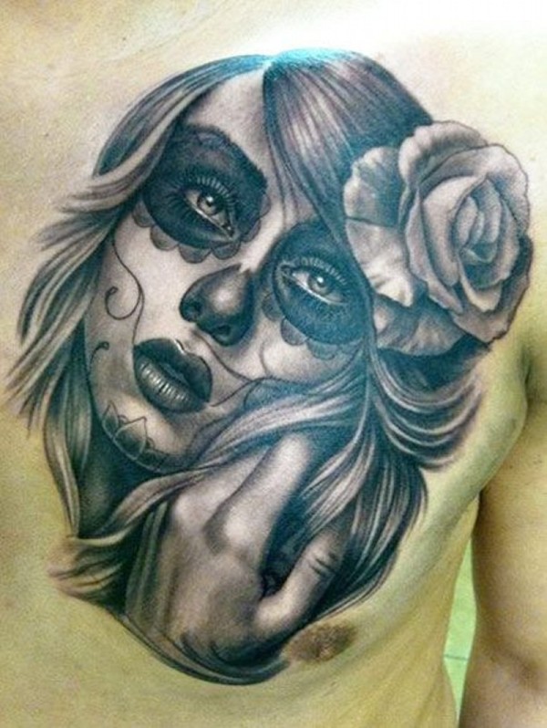 胸部死亡女郎和玫瑰纹身图案