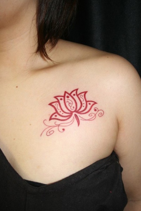 女子胸部红色小莲花纹身图案