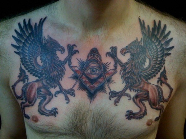 胸部格里芬神兽和眼睛纹身图案