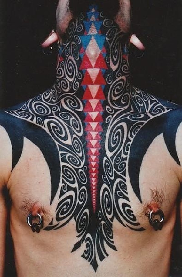 颈部和胸部惊人的五彩部落图腾饰品纹身图案