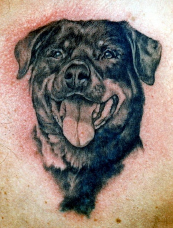 胸部黑灰罗威纳犬微笑吐舌纹身图案