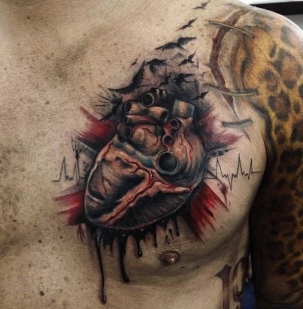 幽灵般的写实心脏胸部纹身图案