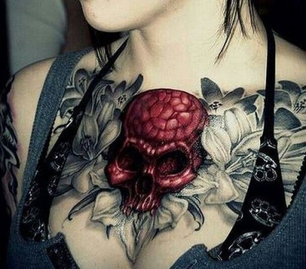 胸部幽灵般的红色骷髅和百合花纹身图案