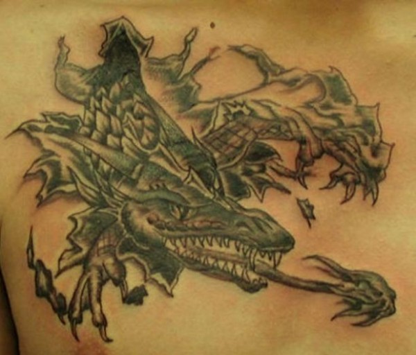 胸部可怕的邪龙皮肤撕裂纹身图案