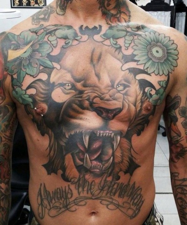 胸部巨大的咆哮的狮子纹身图案