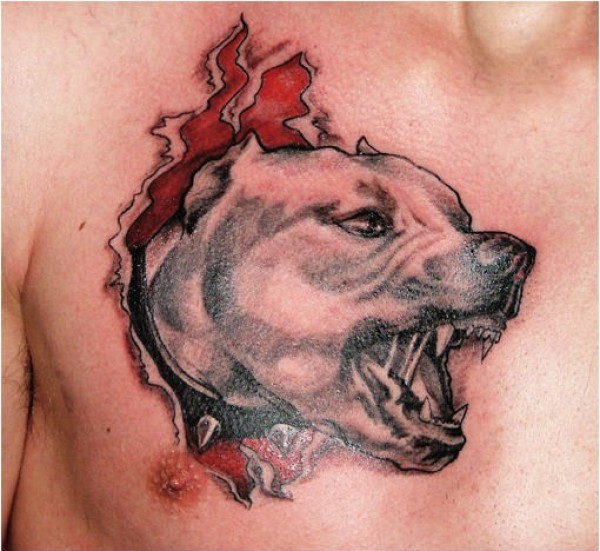 男子胸部攻击性狗皮肤撕裂纹身图案