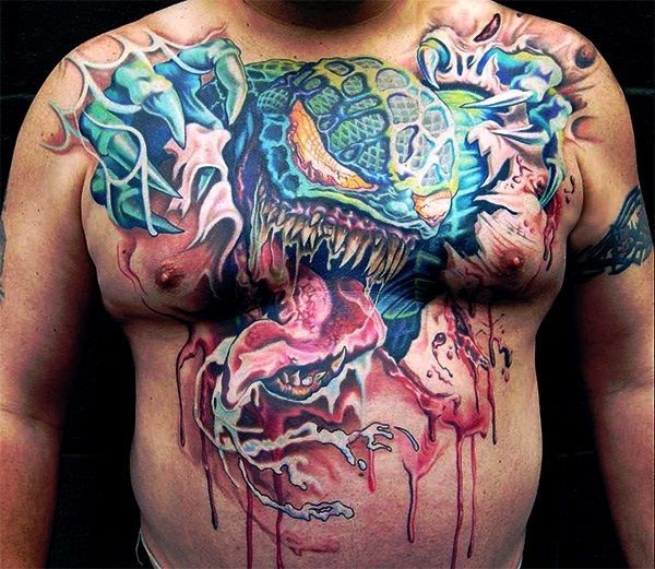 胸部鲜艳的可怕怪物纹身图案