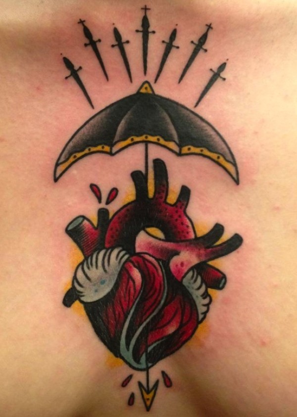 胸部心脏雨伞和匕首纹身图案