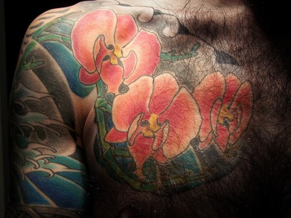胸部红色的兰花纹身图案