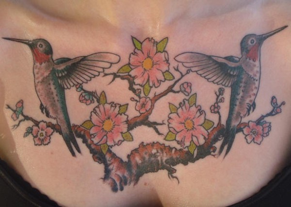 对称的蜂鸟花卉胸部纹身图案