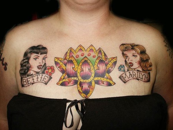 胸部school荷花与美女肖像纹身图案