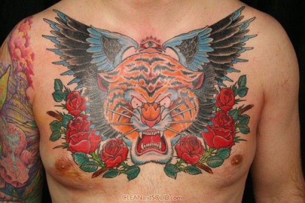 胸部老虎头翅膀和玫瑰纹身图案