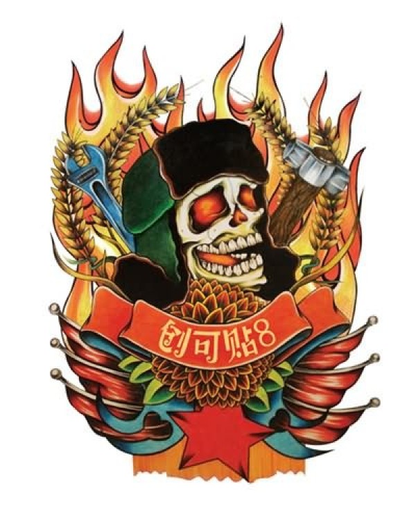 骷髅火焰和大麦五角星汉字纹身图案手稿