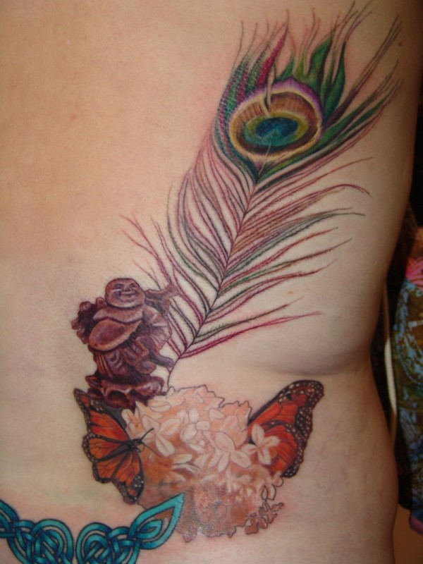 中国风佛像蝴蝶花朵孔雀羽毛纹身图案
