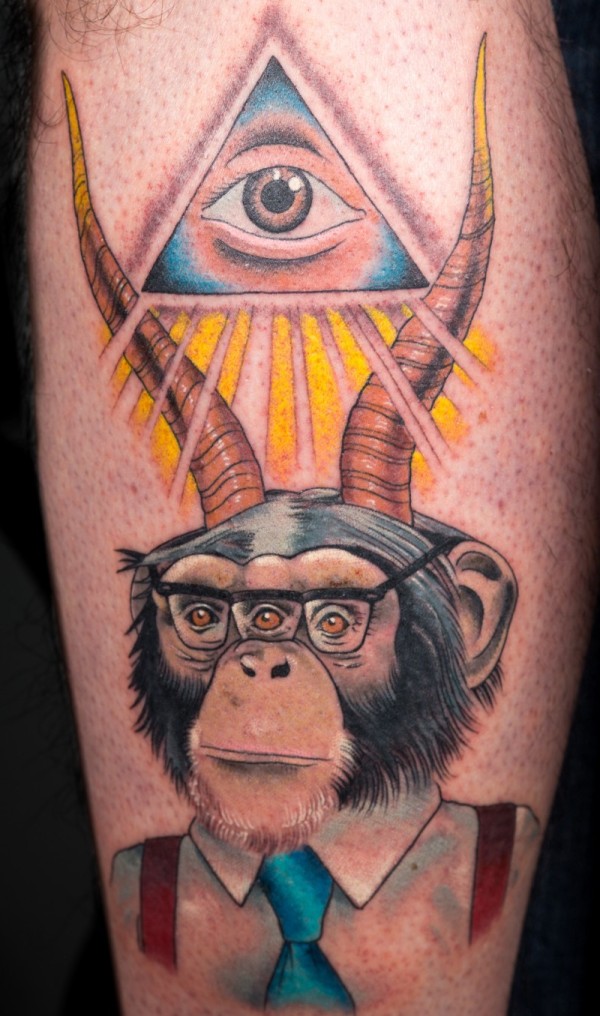 有角的黑猩猩与眼睛三角形纹身图案