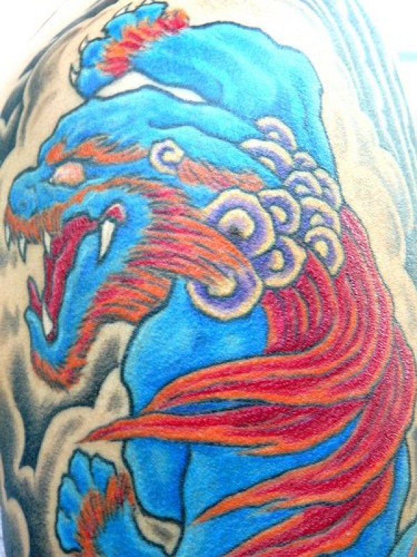 中式彩色唐狮纹身图案