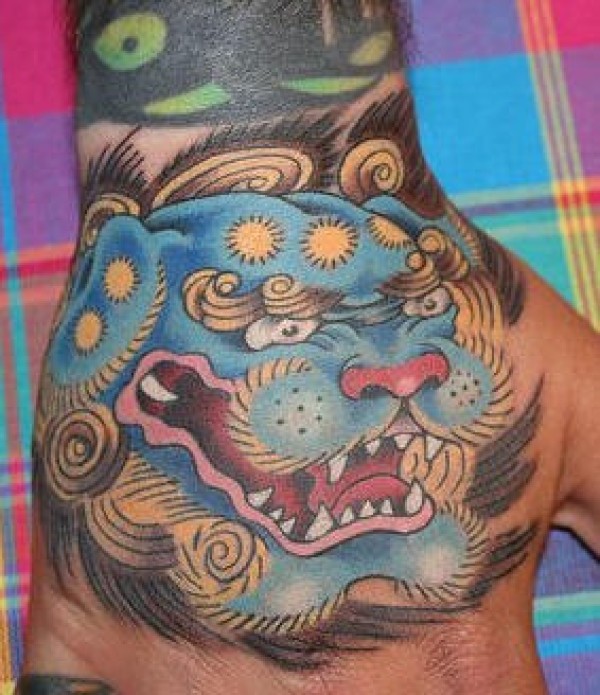 手背唐狮头像纹身图案