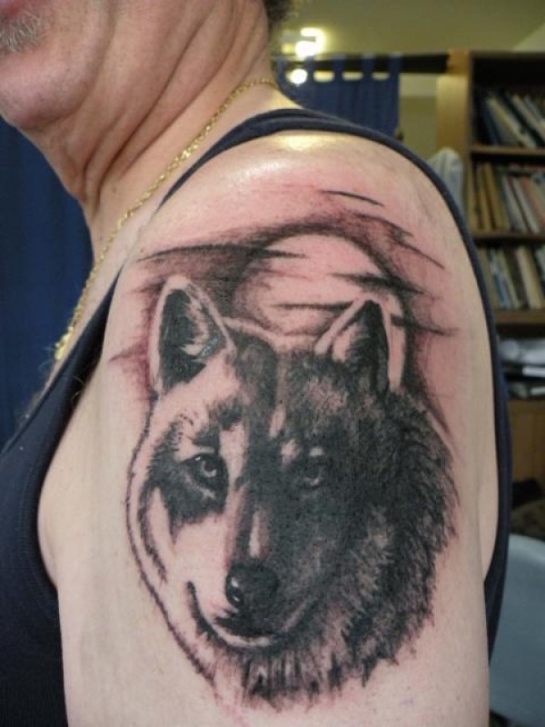 手臂经典的狼头月亮纹身图案