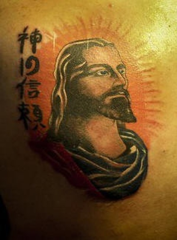 耶稣肖像和中国汉字纹身图案