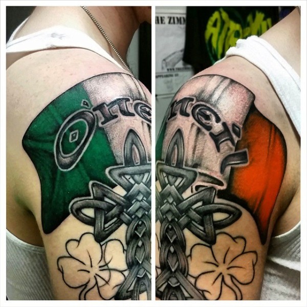 手臂彩色爱尔兰国旗十字架和四叶草纹身图案