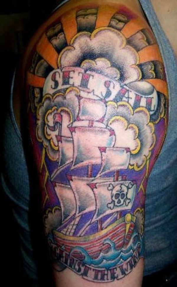 手臂经典海盗船彩色纹身图案