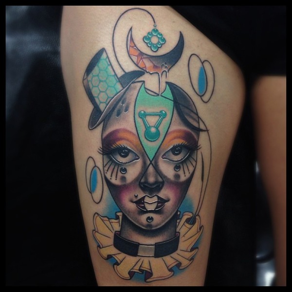 大腿滑稽的彩色小丑与各种符号纹身图案