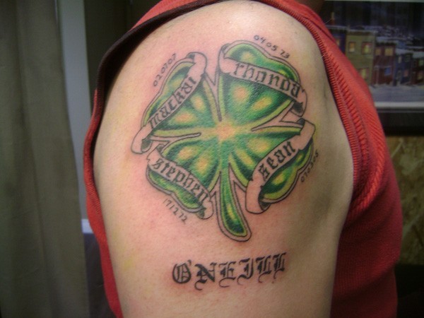 大臂爱尔兰四叶草与字符纹身图案