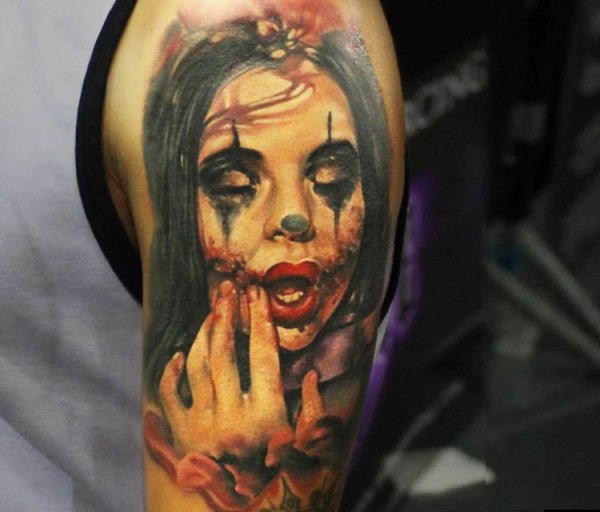 大臂彩色令人毛骨悚然的女性小丑纹身图案