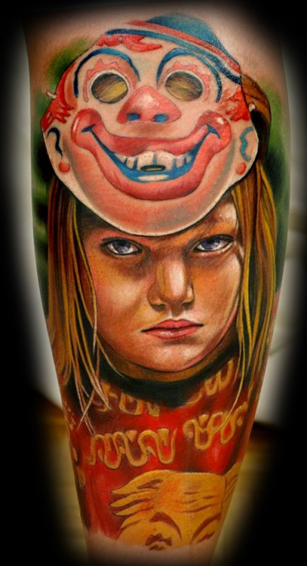 彩色女孩肖像与小丑面具纹身图案