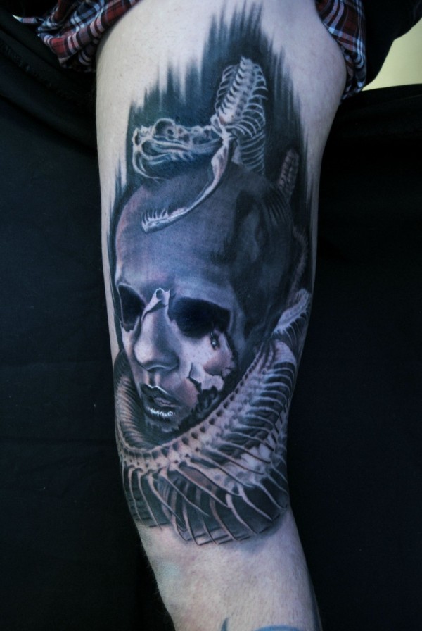 手臂令人毛骨悚然的彩色怪物小丑蛇骨架纹身图案