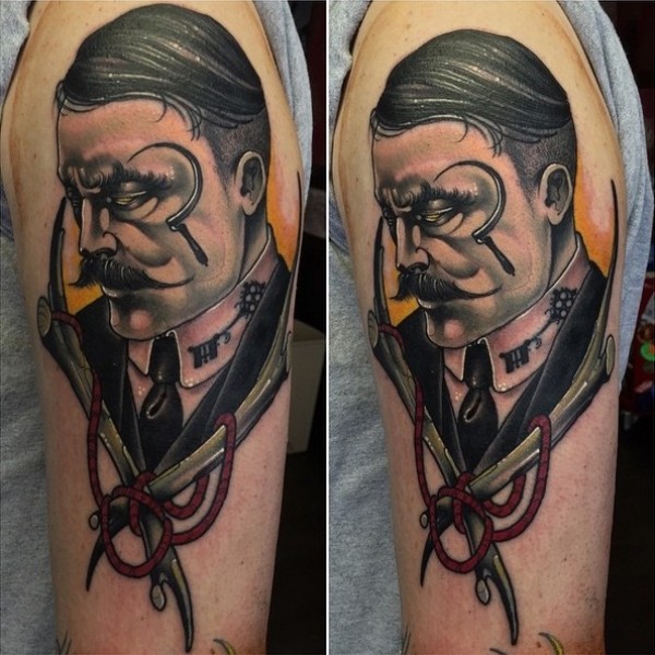 大臂彩色神秘男子肖像纹身图案