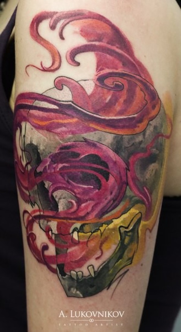 大臂现代传统风格彩色骷髅和蒸汽纹身图案