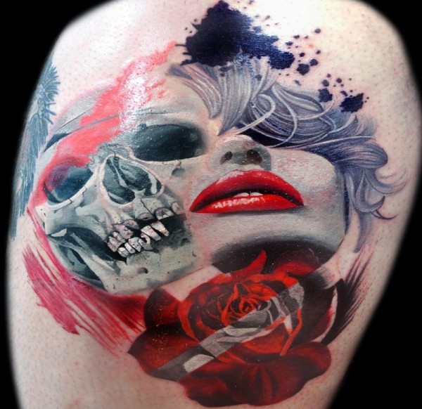 彩绘写实大腿妇女骷髅和玫瑰纹身图案