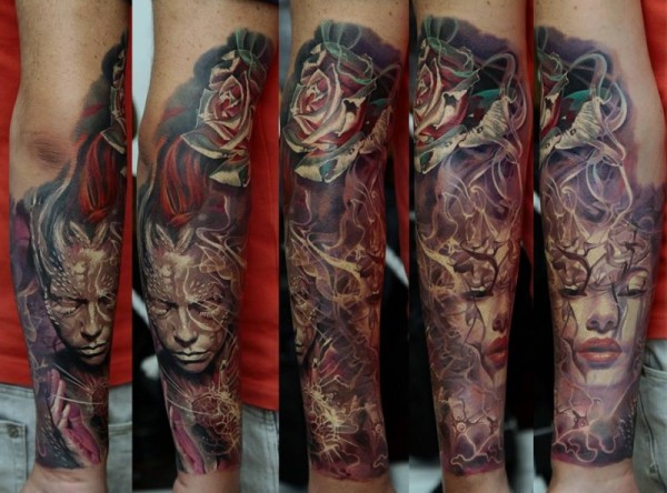 手臂彩绘精致的女性肖像和玫瑰纹身图案