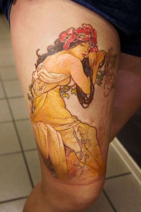 大腿华丽的女人肖像和花朵纹身图案