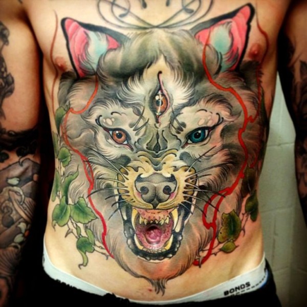 腹部new school丰富多彩的狼头和花朵纹身图案