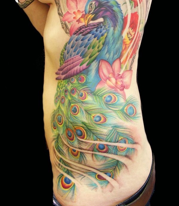 侧肋壮观的插画风格孔雀花朵纹身图案