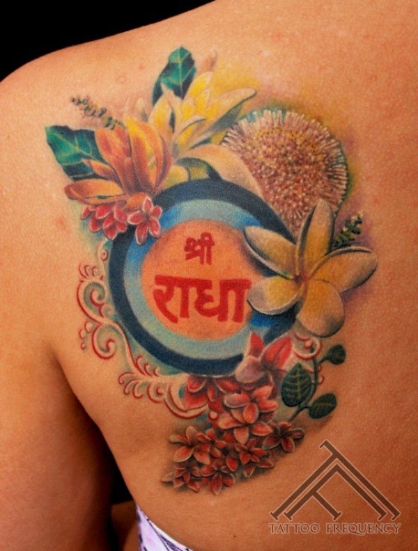 背部漂亮的各种花朵和字符纹身图案
