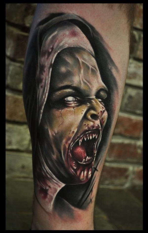 写实风格彩色血腥吸血鬼女人肖像纹身图案
